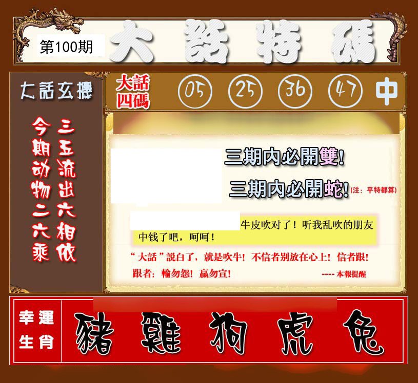 100期六肖中特【鸡虎羊狗龙蛇】开:?00 |
