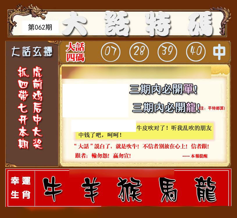062期六肖中特【虎羊猴牛马兔】开:?00 |