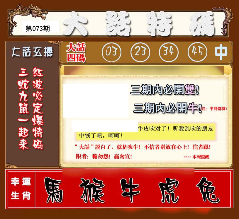 | 073期推荐⑤肖:猪鼠蛇兔虎 |