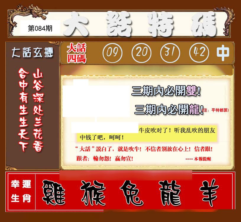 084期六肖中特【虎猴狗牛猪马】开:?00 |