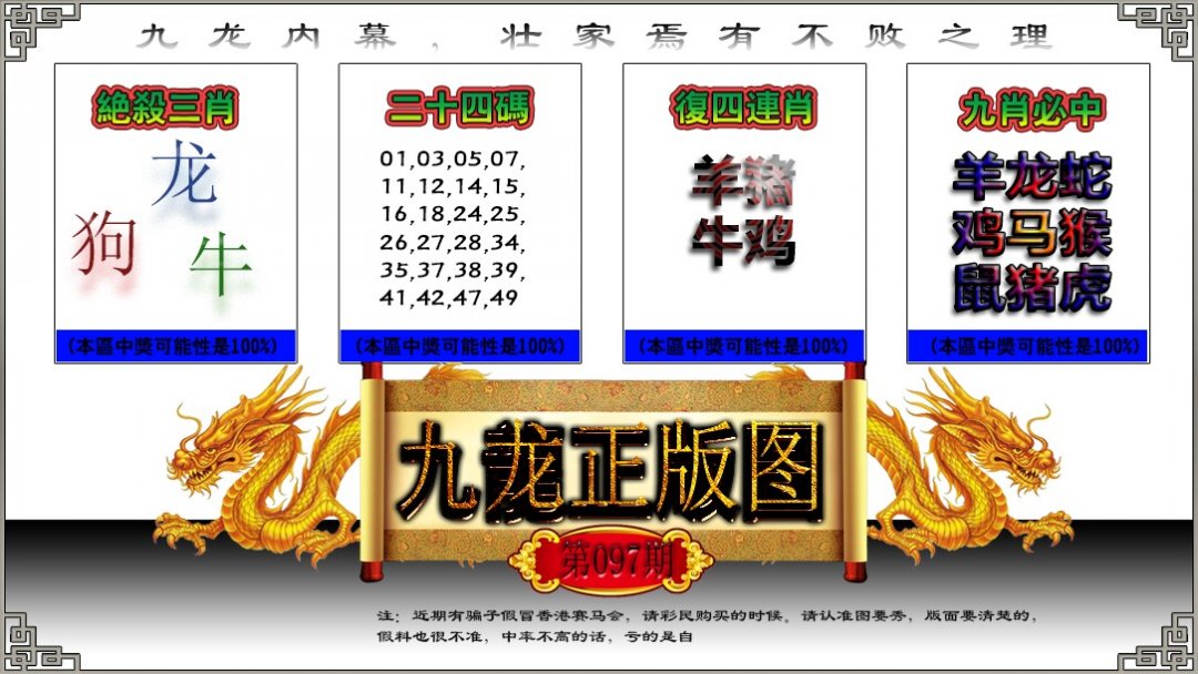 097期:四组三连肖 【狗猪牛】【虎鸡牛】 【羊马龙】【羊蛇牛】 | |