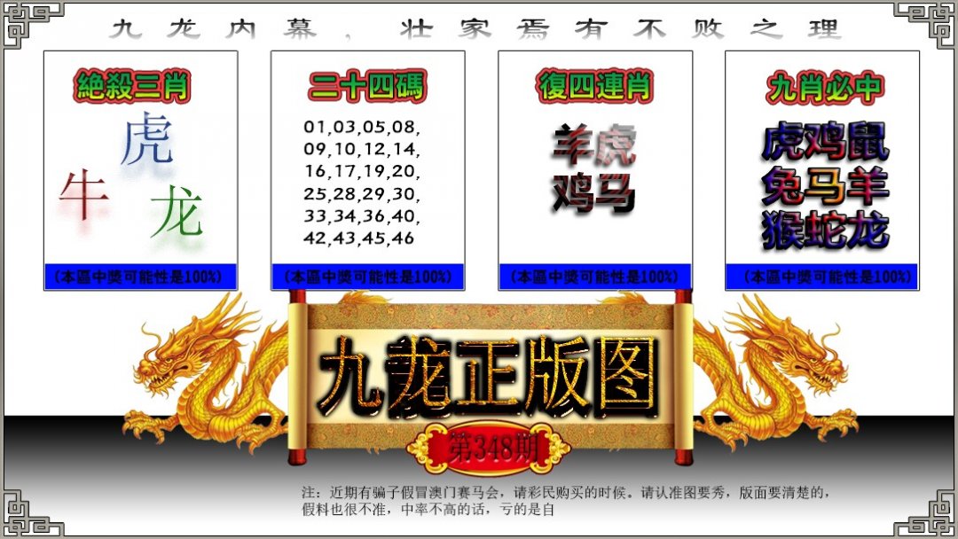 348期:四组三连肖 【蛇猪龙】【兔猴牛】 【鼠鸡蛇】【蛇鼠猴】 | |